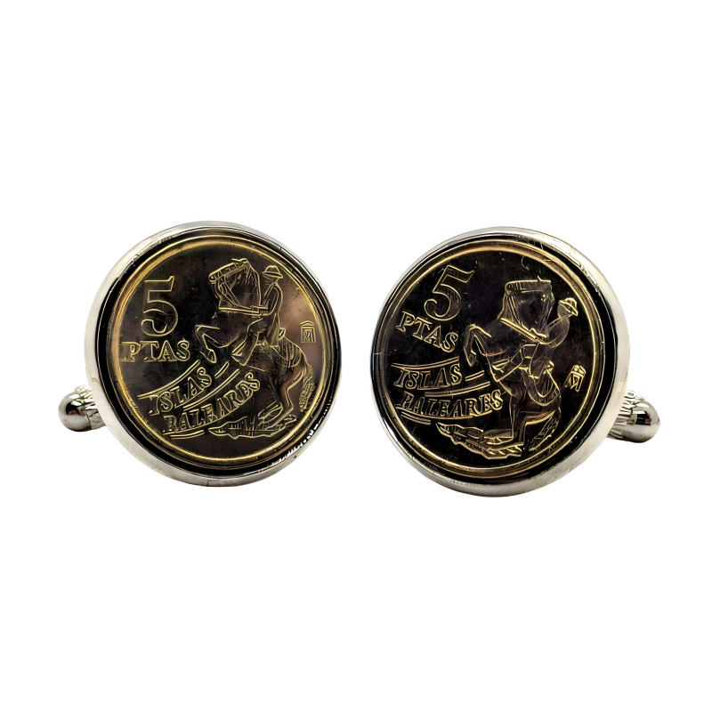 Los gemelos "Cavaller" son una maravillosa muestra de la elegancia y la pasión por la cultura de las Islas Baleares. Cada par de gemelos está compuesto por pesetas auténticas que rinden homenaje a esta hermosa región española. En estas monedas se representa un jinete "cavaller en payés" montando un caballo menorquín, símbolo de la tradición ecuestre y la conexión con la naturaleza de las islas. Estos gemelos son el complemento perfecto para los aficionados a la hípica, brindándoles la oportunidad de lucir con orgullo su amor por esta noble disciplina.